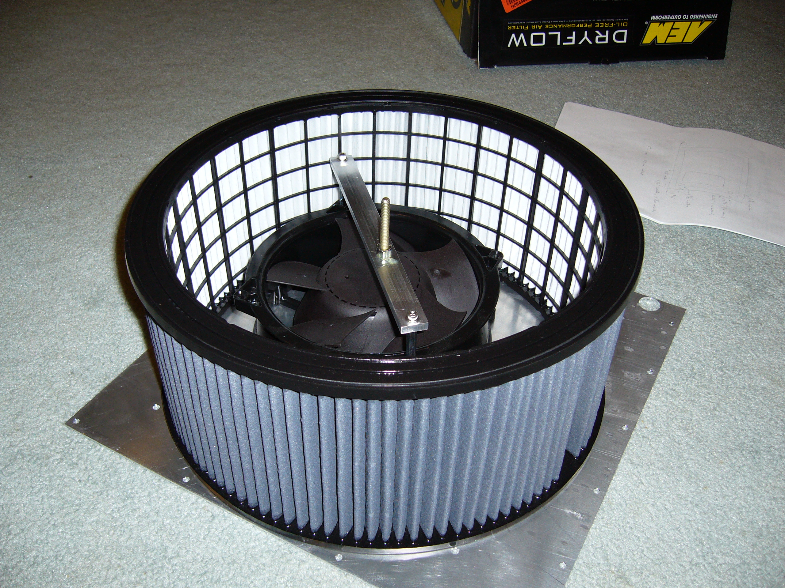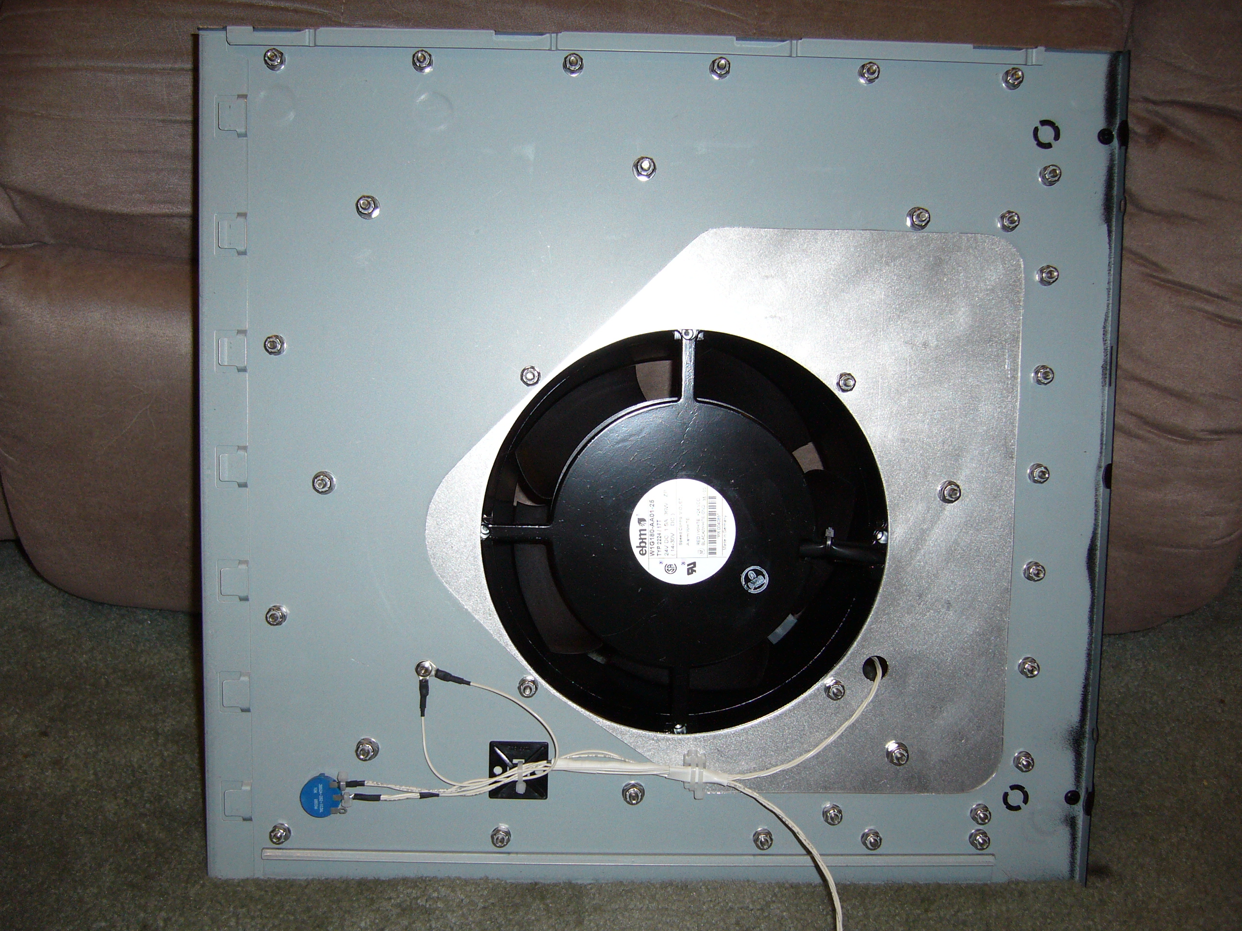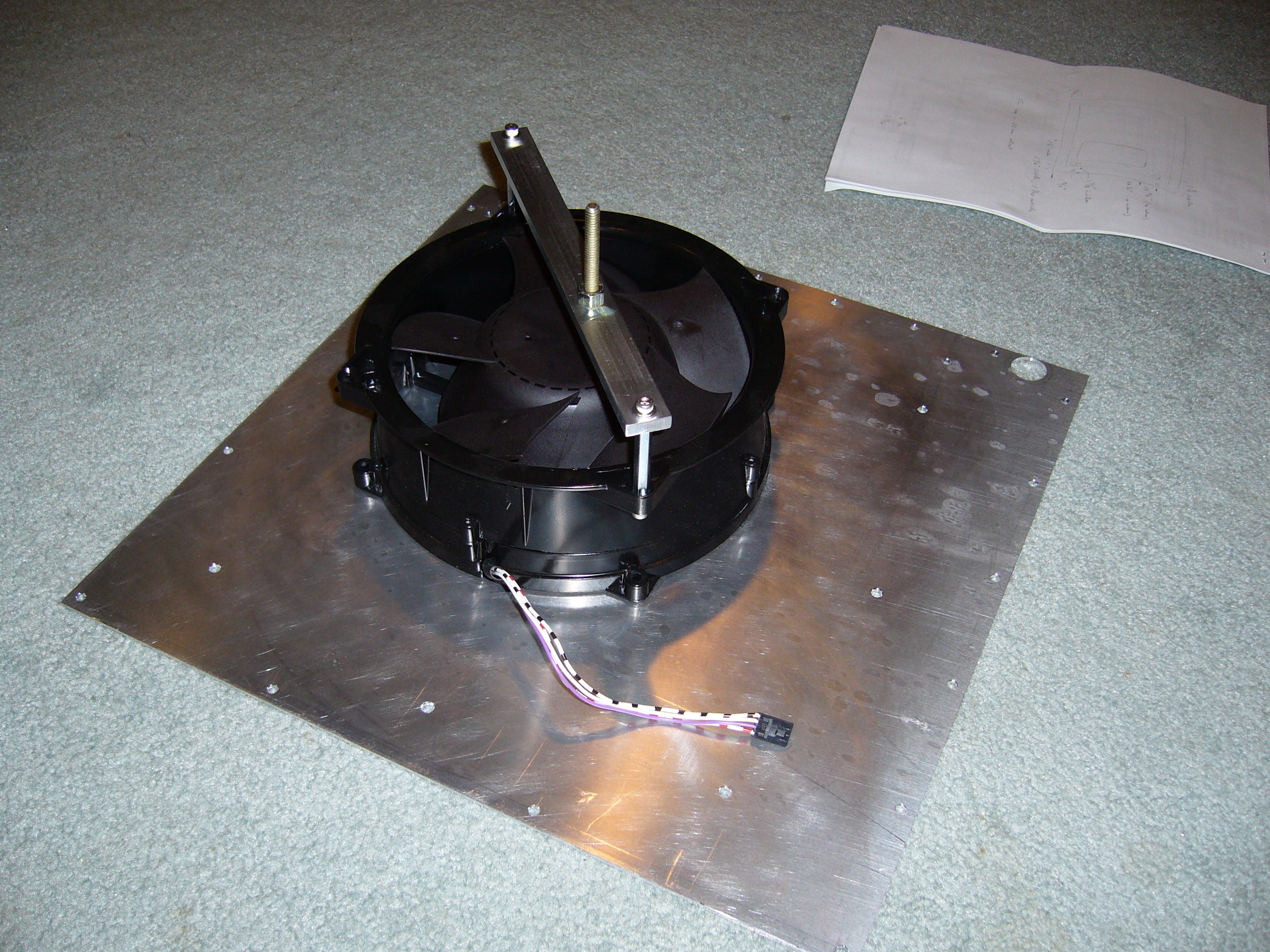 Here is a mockup of the fan, an EBM W1G180-AA01-25 (24V 37W 375CFM max, ~150CFM min) diagonal fan on its (incomplete) reinforcing plate.