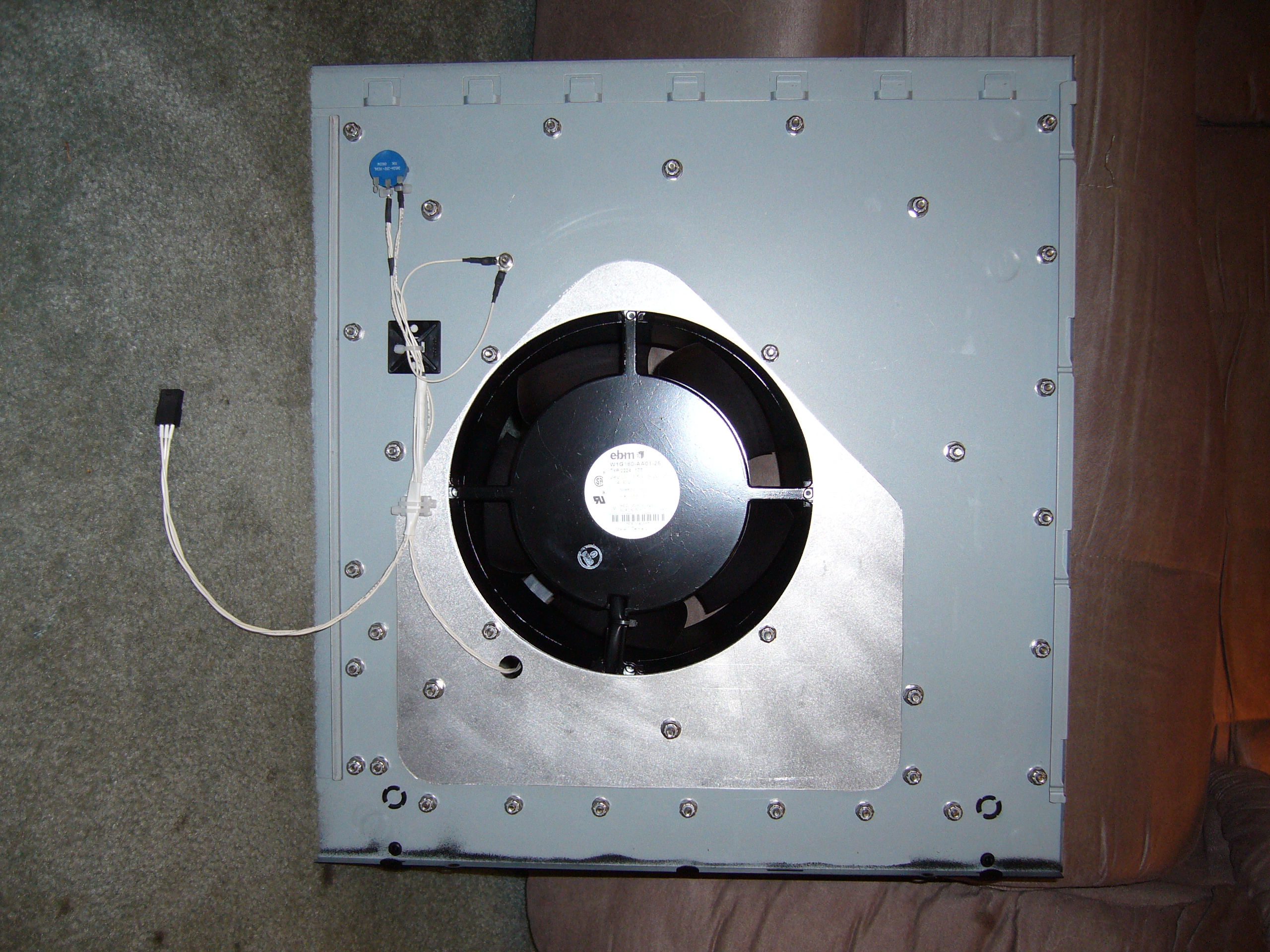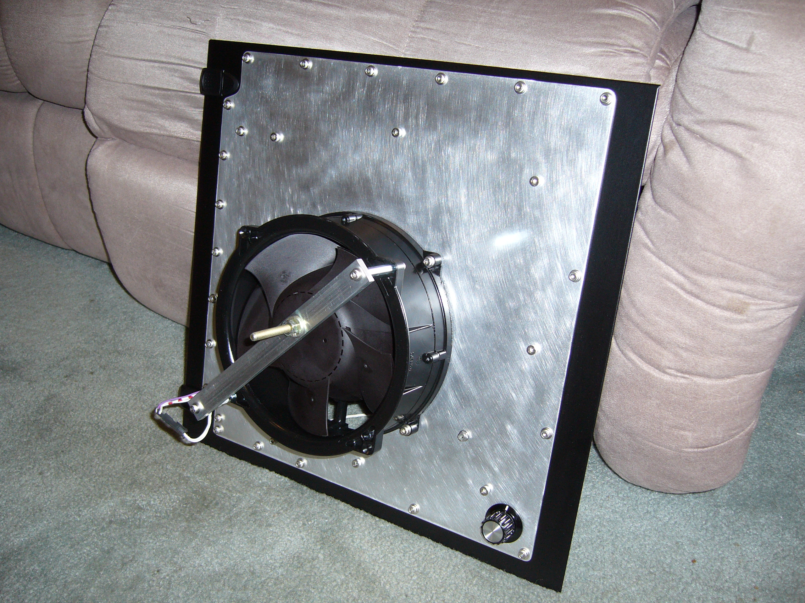 Here is a mockup of the fan, an EBM W1G180-AA01-25 (24V 37W 375CFM max, ~150CFM min) diagonal fan on its (incomplete) reinforcing plate.