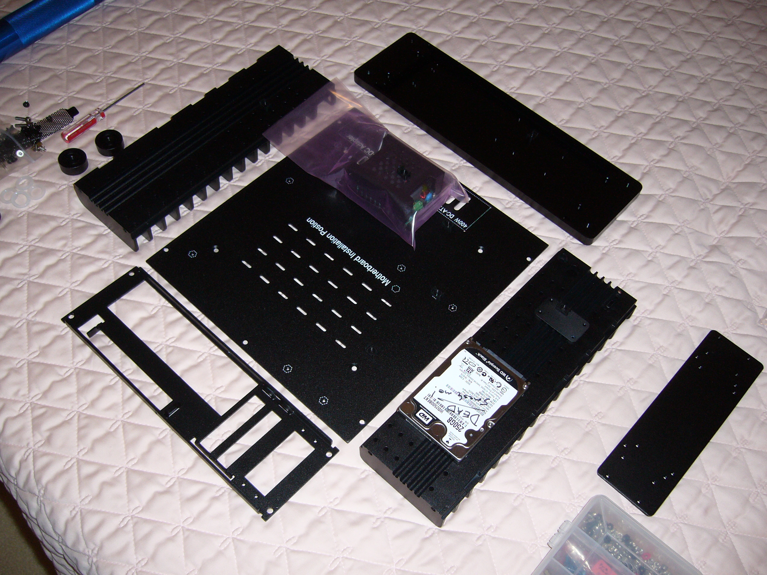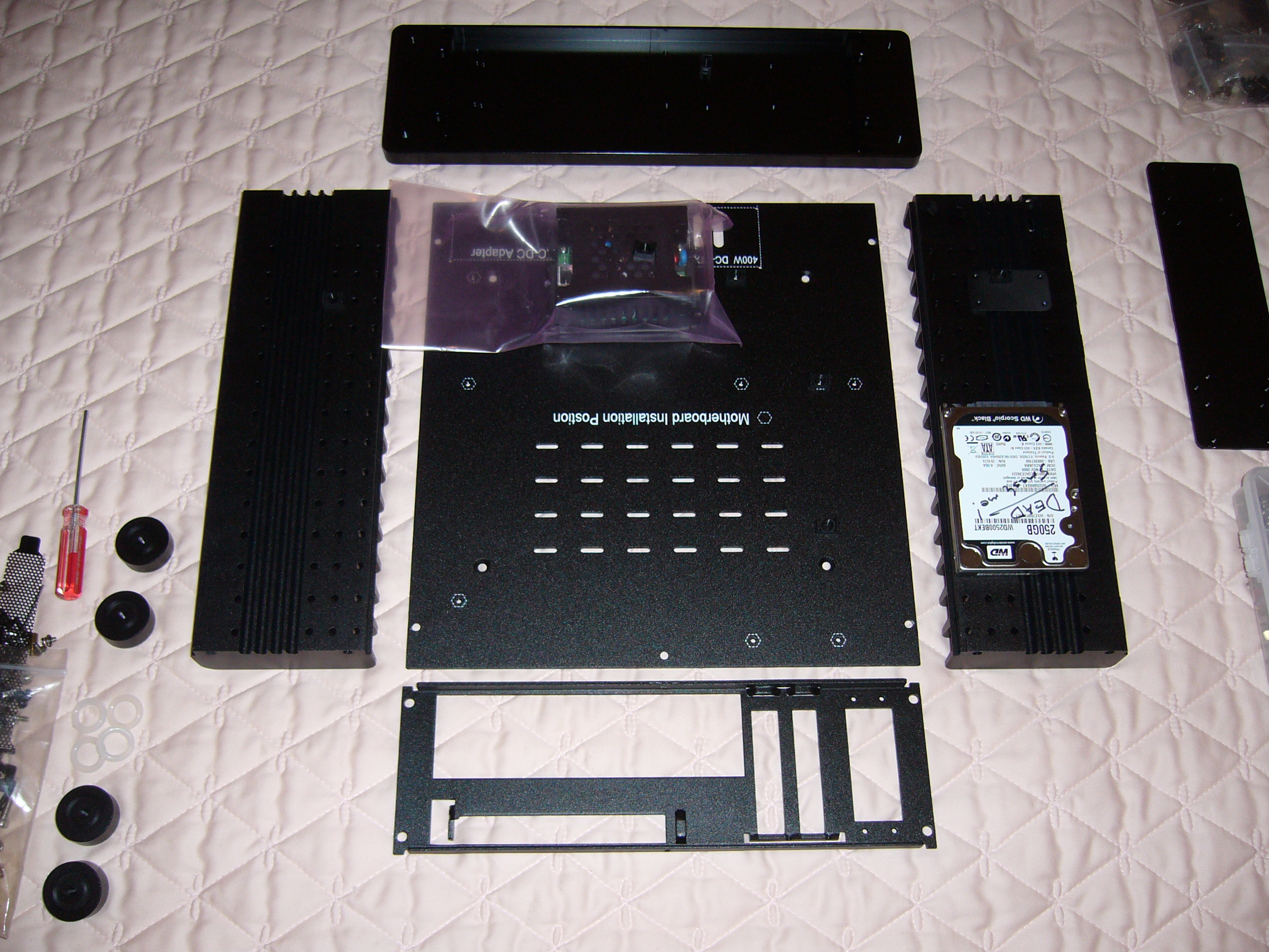 It is always a good idea to lay out your parts, to visualize how everything will fit together. Note the barely-visible mini heat pipe retainer and