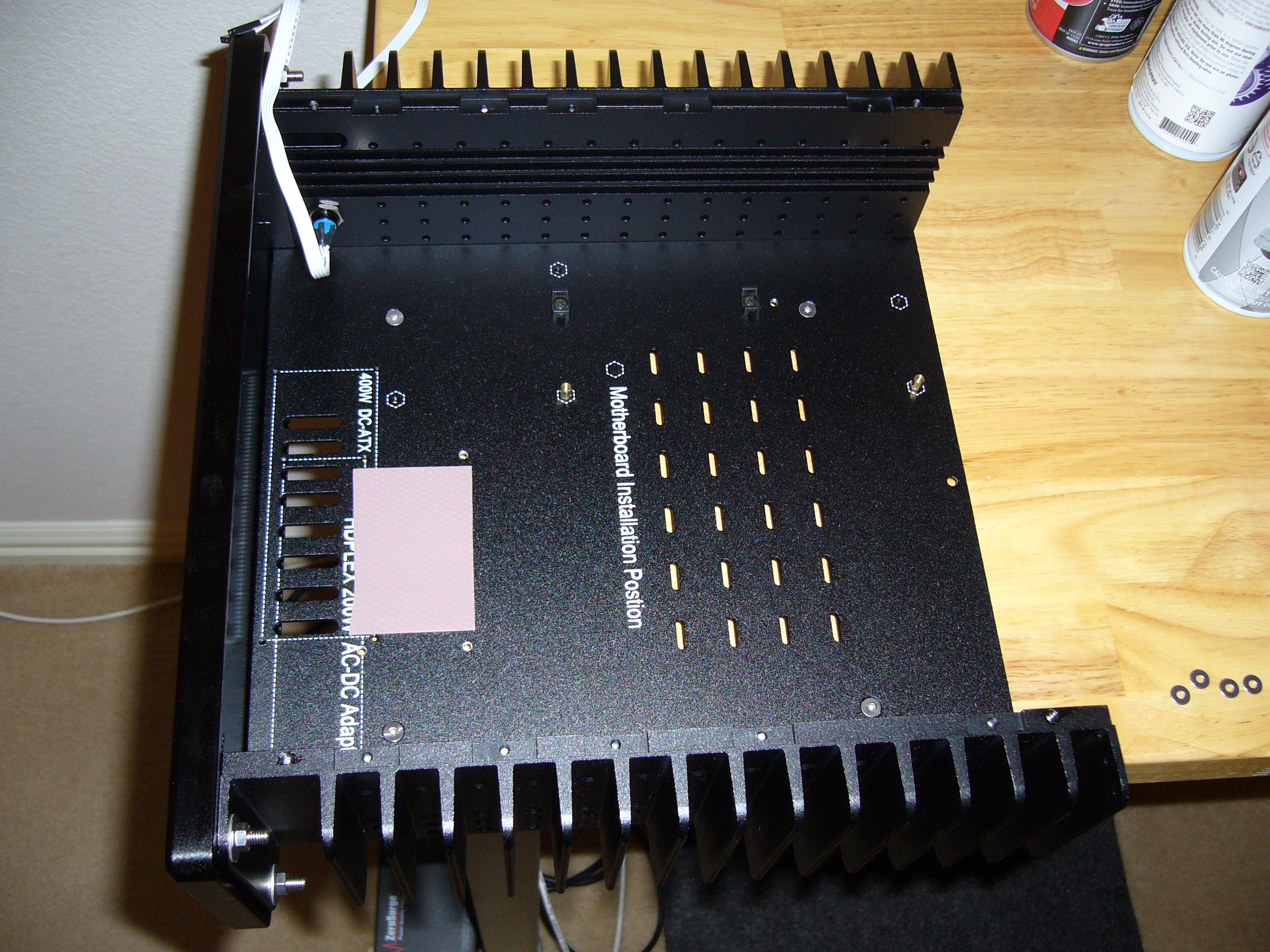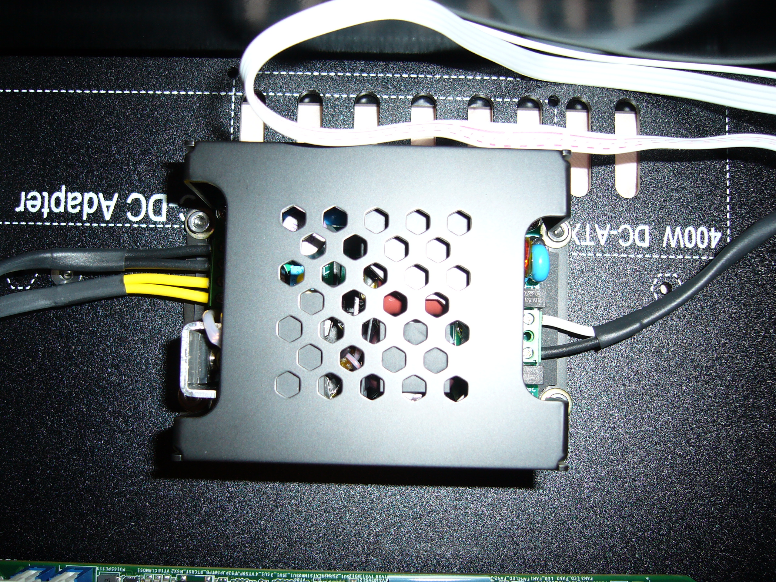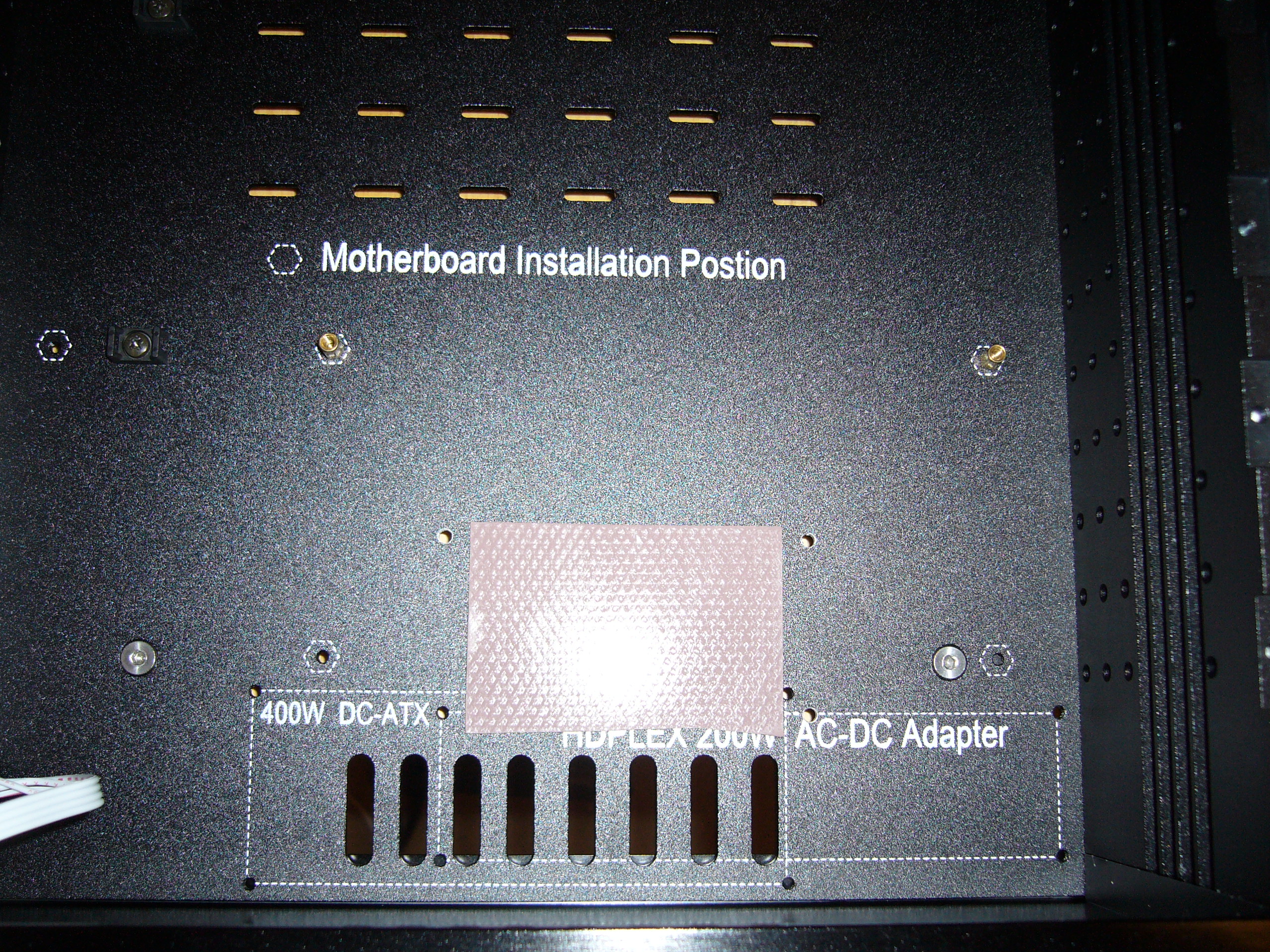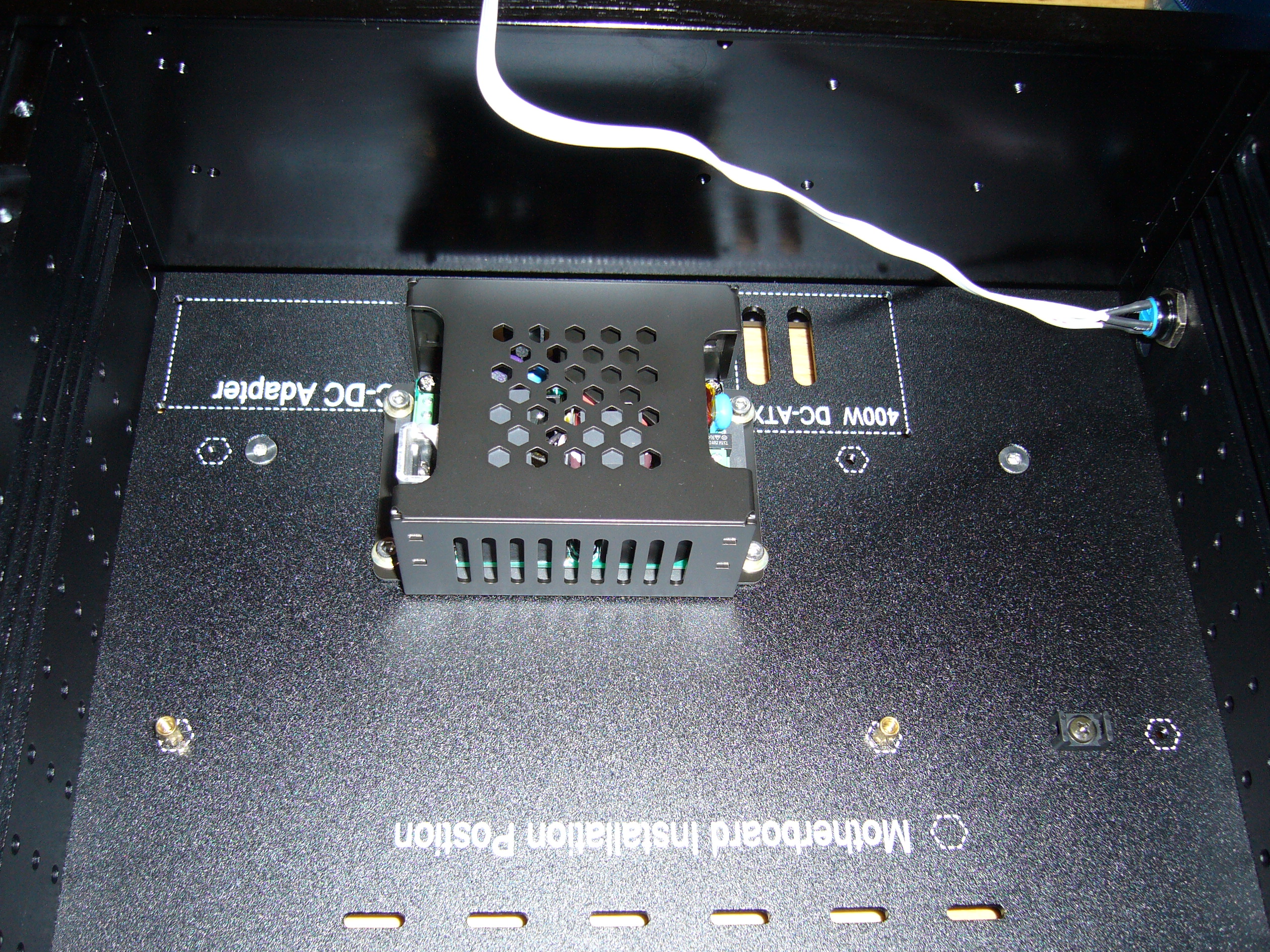 Here you can (kind of) see the mounting hardware arrangement, with washers between the power supply and bottom plate to provide space for the